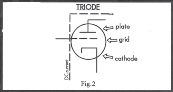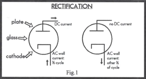 Now, the two element tube created a crucial discovery: this current flowed in only one direction: it was DC, just like a 9 volt battery. As we know, the current that flows through a wall socket to a light bulb is AC, and therefore flows back and forth in both directions. So what was discovered was a way to convert AC to DC, or to rectify: as AC flows back and forth through the filament 120 times per second, the plate produces DC current each time the AC current moves forward. As the AC moves backwards into a negative voltage, the DC stops at zero because a vacuum tube conducts in only one direction. What is left on the plate is 120 pulses of DC per minute. (See Fig. 1)