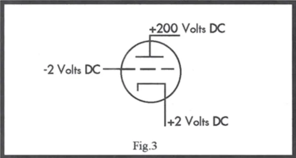So how does it work? To understand, let's see what happens if we keep the plate and cathode voltages constant, but change the bias voltage from -2 volts to, say -1 or 0 volts DC? The tube turns on and more current flows. (fig. 3) Here's why: as the screen becomes more positive in relation to the cathode, electrons (current) begin to "see" past the grid as it's not so negatively charged, and they start to feel attracted to the much larger positive charge at the plate beyond. As the grid becomes more positive, it puts less pressure on the electrons at the cathode to stay put, and eventually they shoot past the grid toward the plate. Hence, as the grid becomes more positive in relation to the cathode, more current flows from the cathode through the plate. Conversely, as the grid becomes more negative in relation to the cathode, less current flows through the tube.